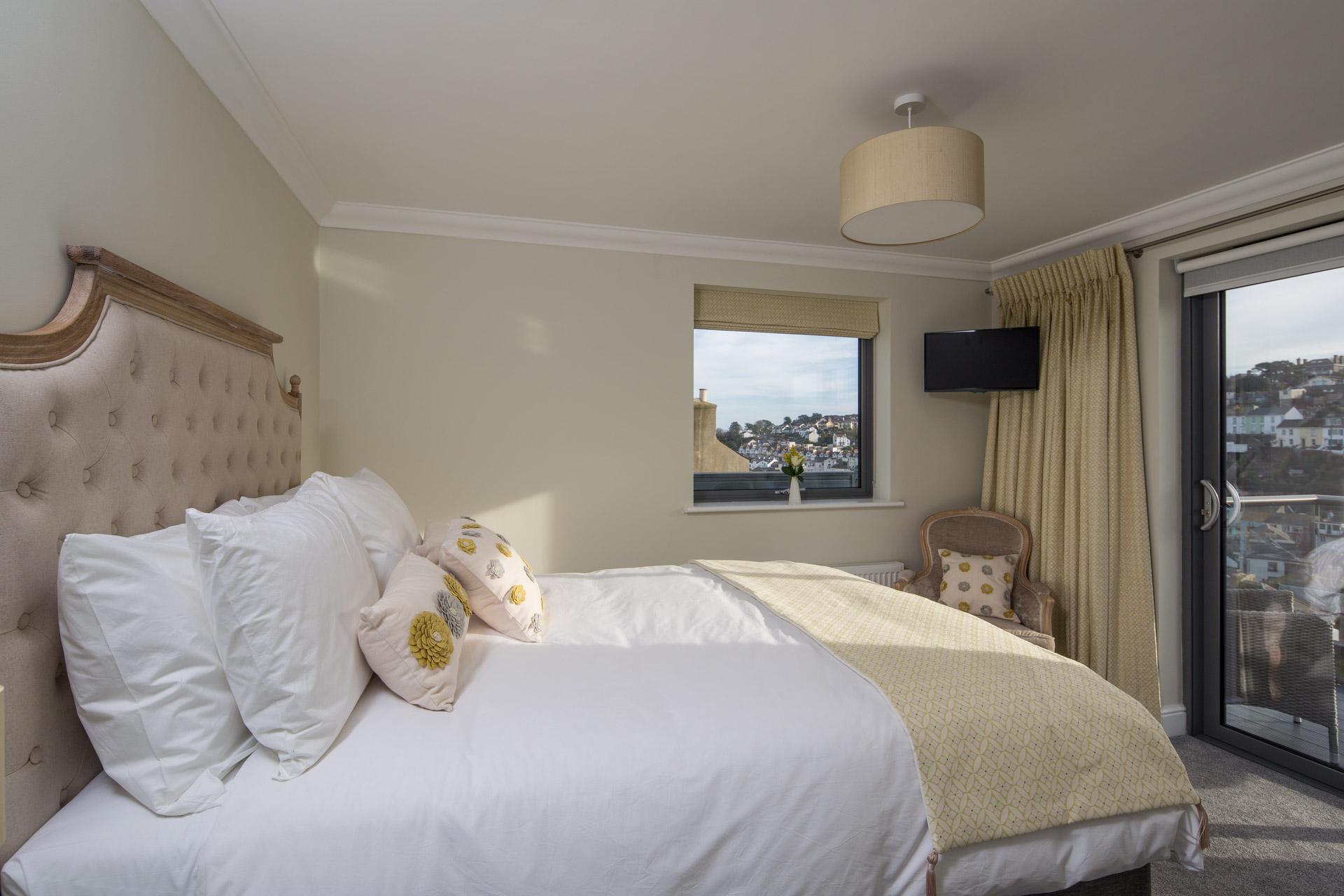 Guest rooms are at the rear of the property facing south east, making the most of the morning sun, and all have outstanding views to the sea, harbour, and Brixham townscape. Bedrooms have Superking or Kingsize Hypnos beds with Egyptian cotton linen, sliding glass doors with either private balconies or Juliette's, en-suites with walk-in showers or bath with shower over, and environmentally friendly toiletries from "Eco Boutique".